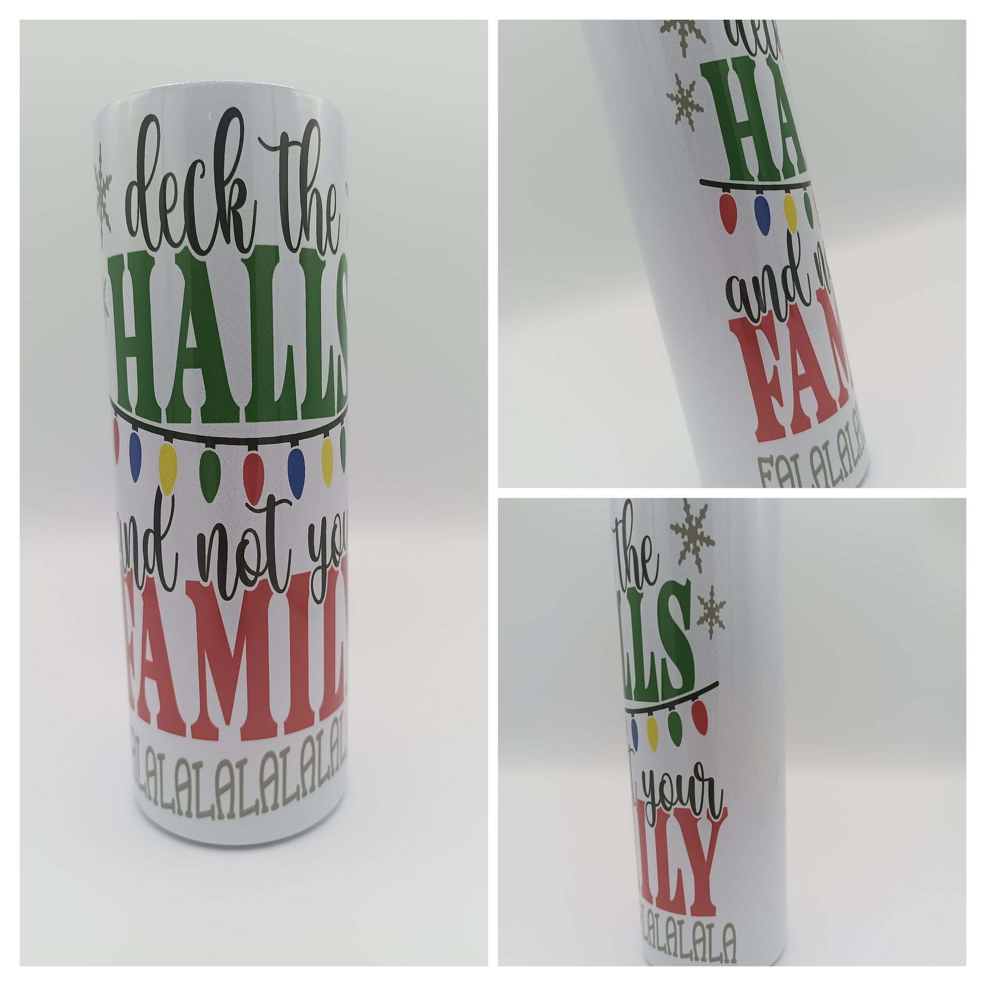 20oz Skinny Tumbler with "deck the halls, and not your family" text. Comes with a lid and a straw.