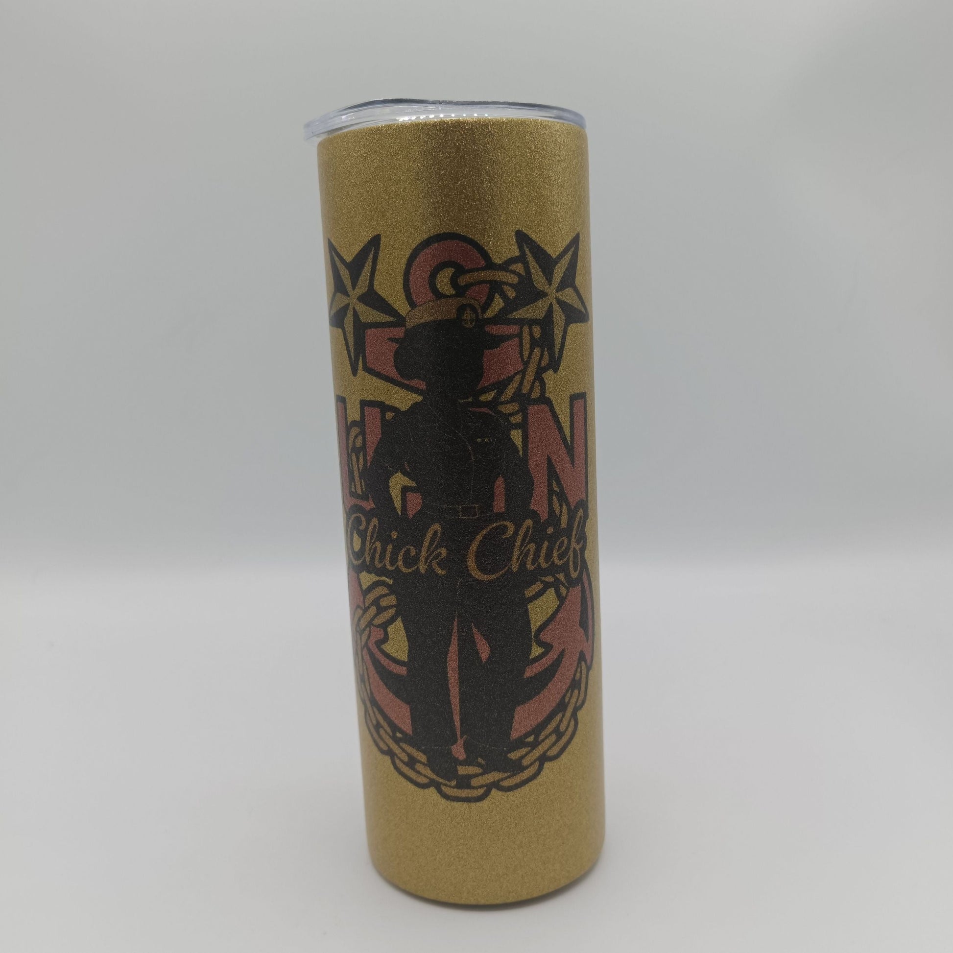 20oz Gold glitter tumbler with our signature Chick Chief emblem. Comes with a lid and a straw.