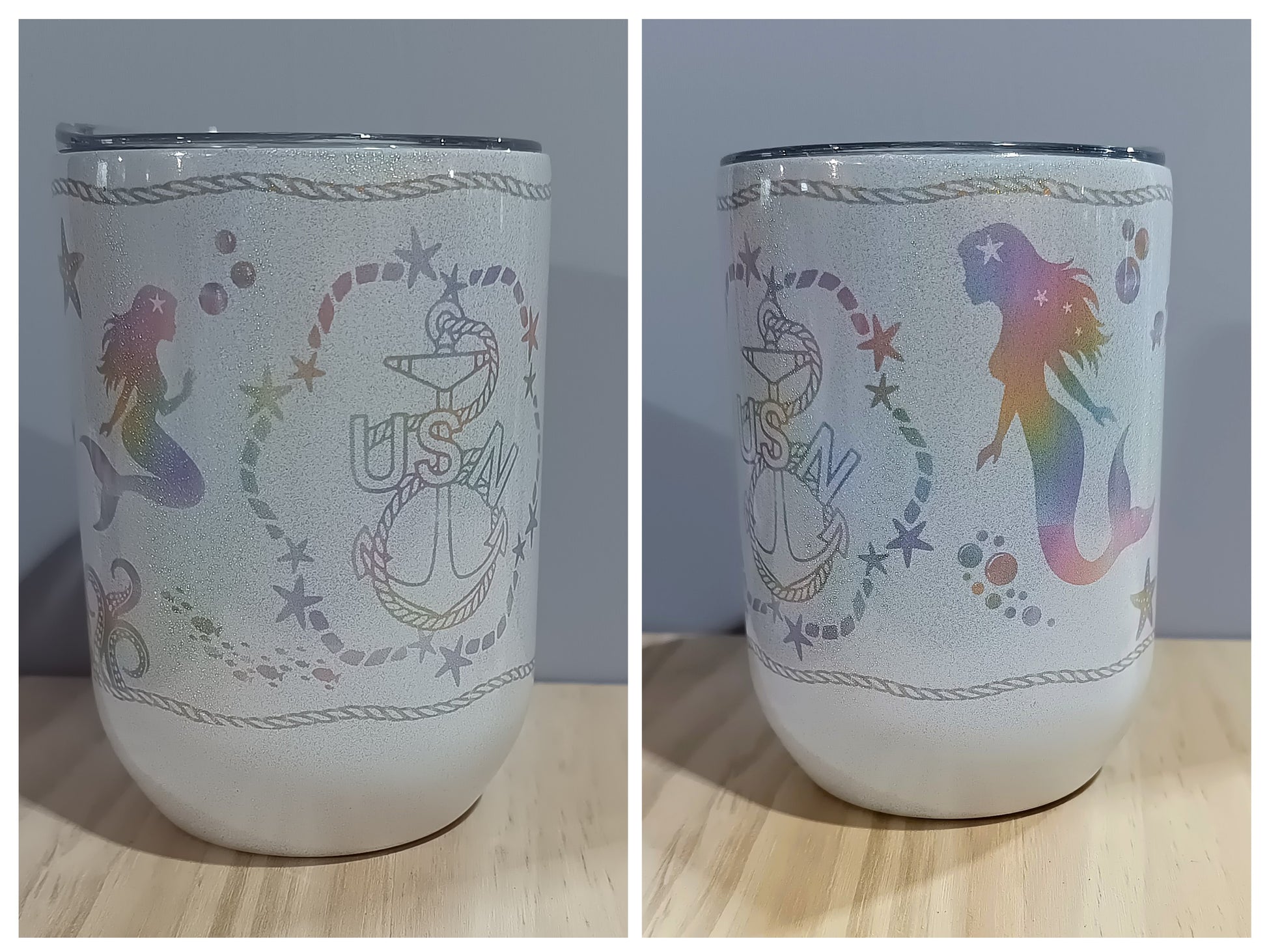 Rainbow mermaid and anchor design on a white shimmer wine tumbler, great for any beverage!