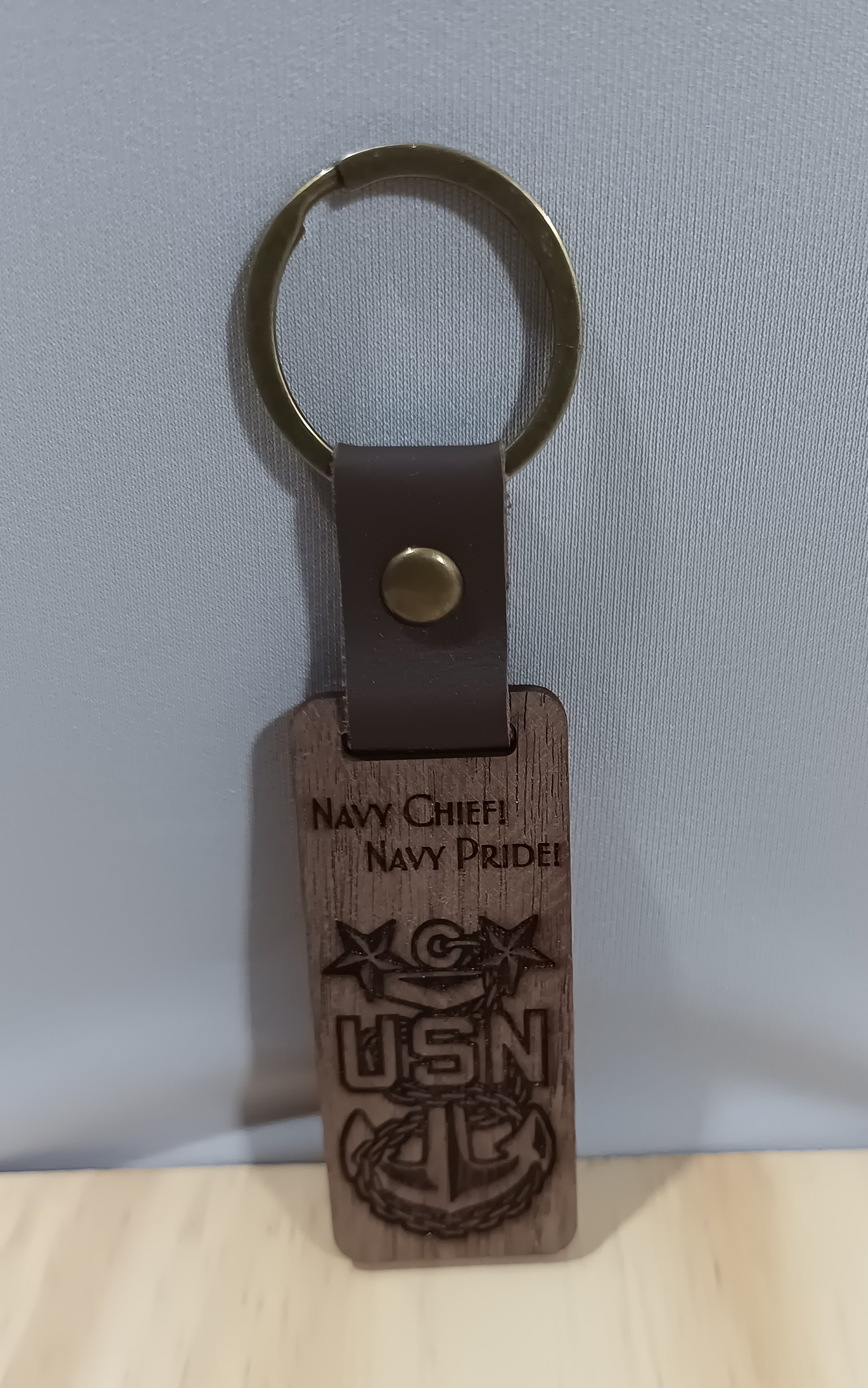 Wooden keychain with Master Chief anchor engraved on one side. Dimensions roughly 1in x 2.5in